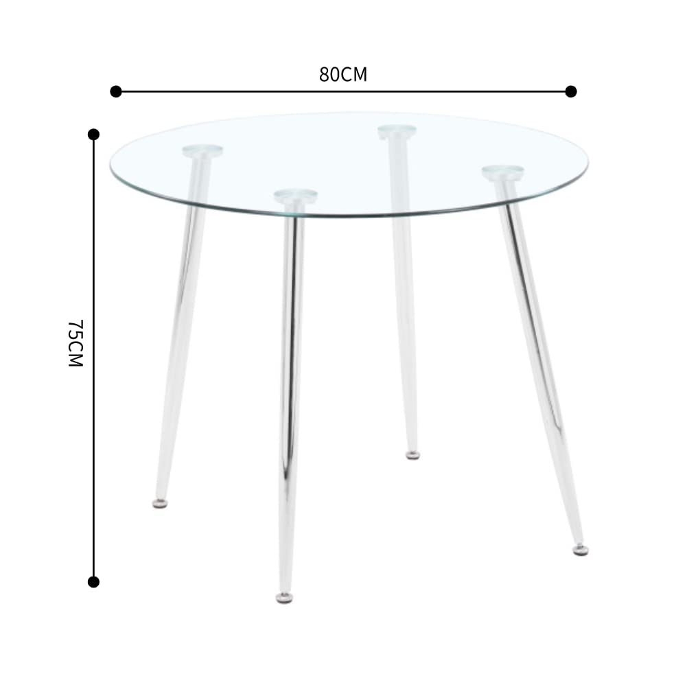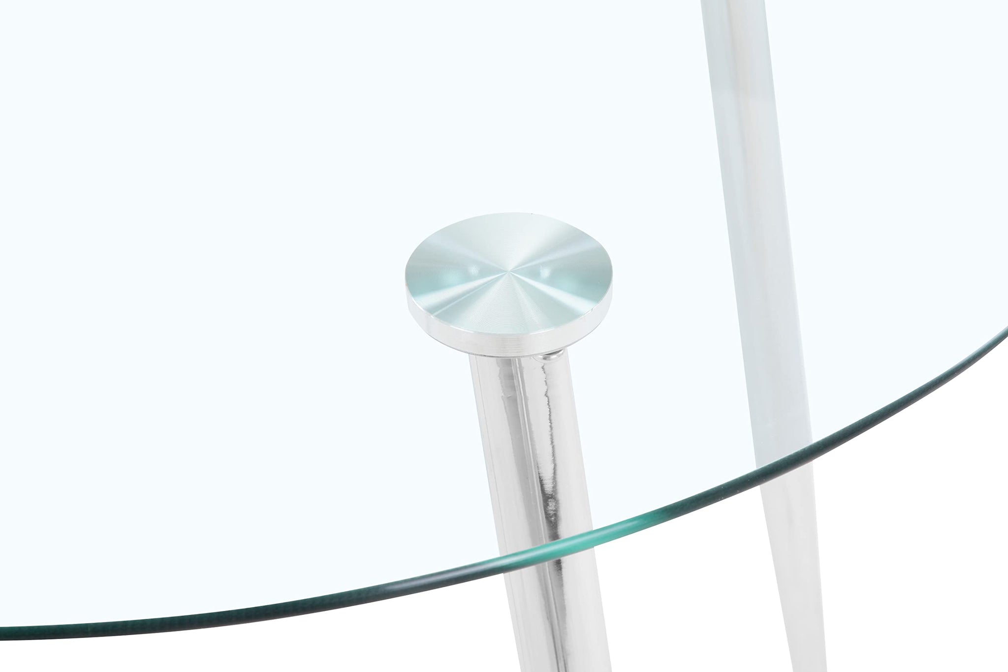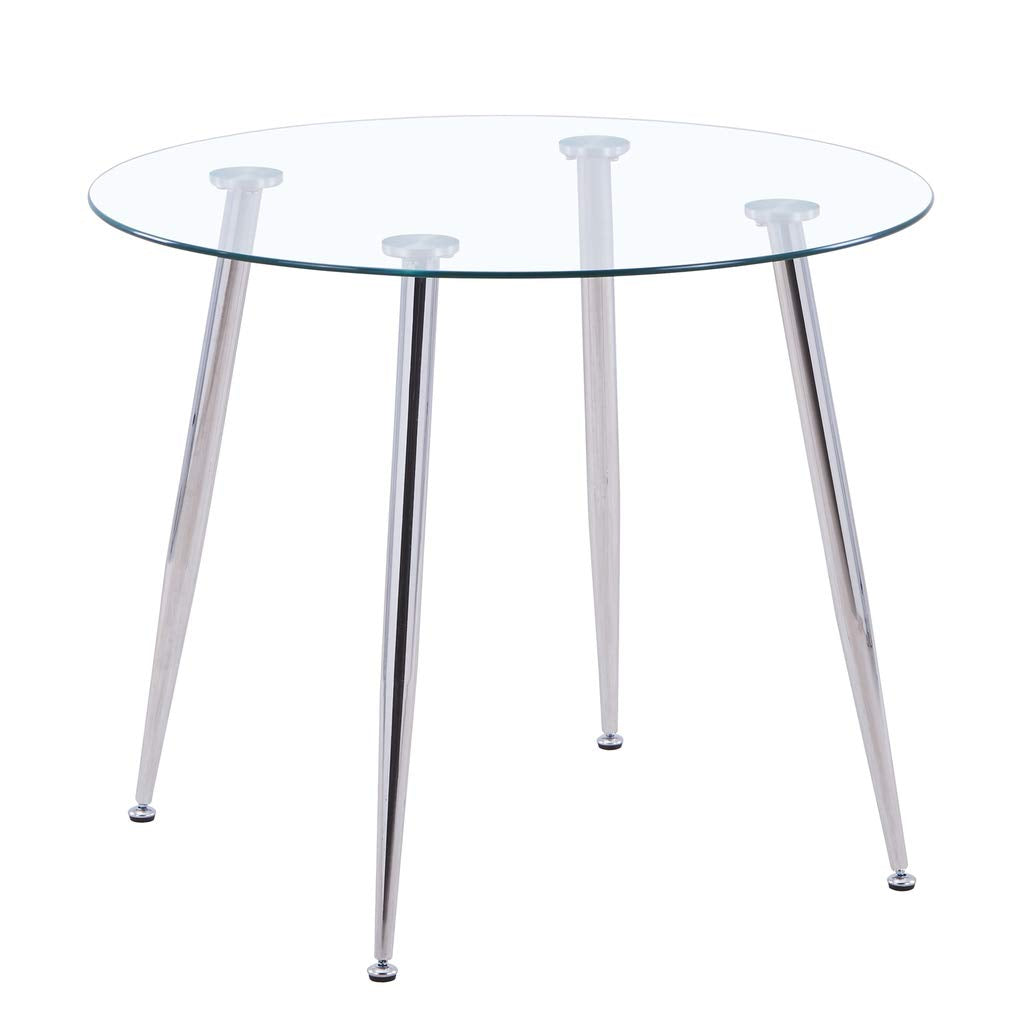 Esstisch Rund: Die Tischplatte besteht aus transparentem gehärtetem Glas. Die Tischbeine sind Metallbeine.