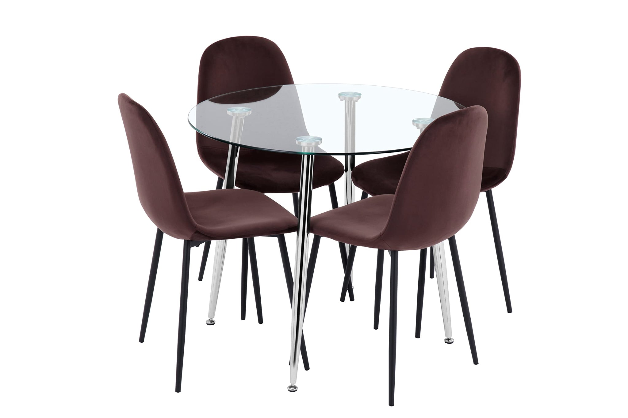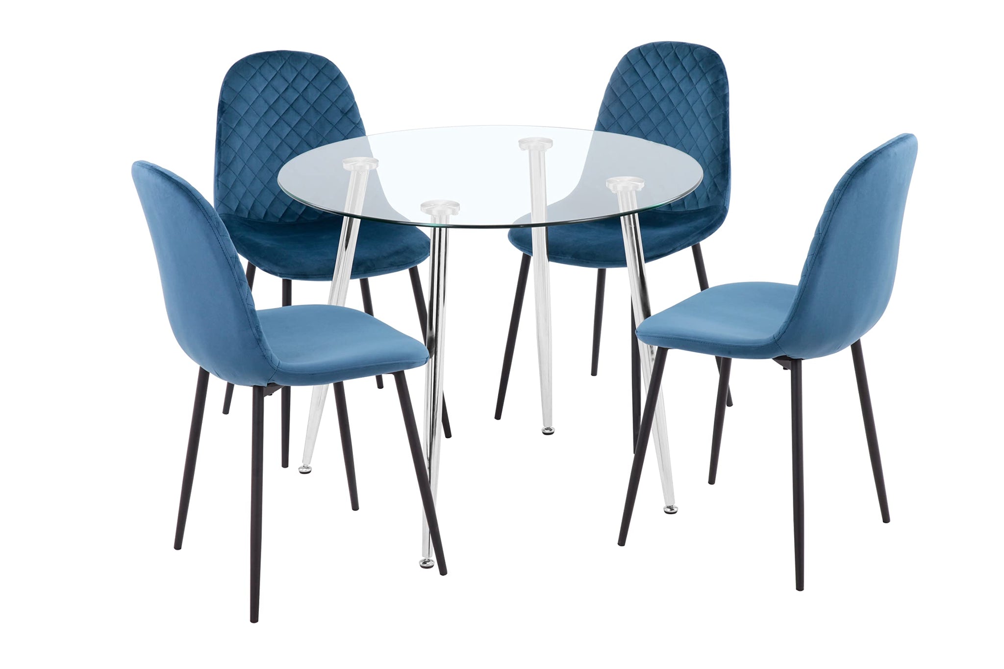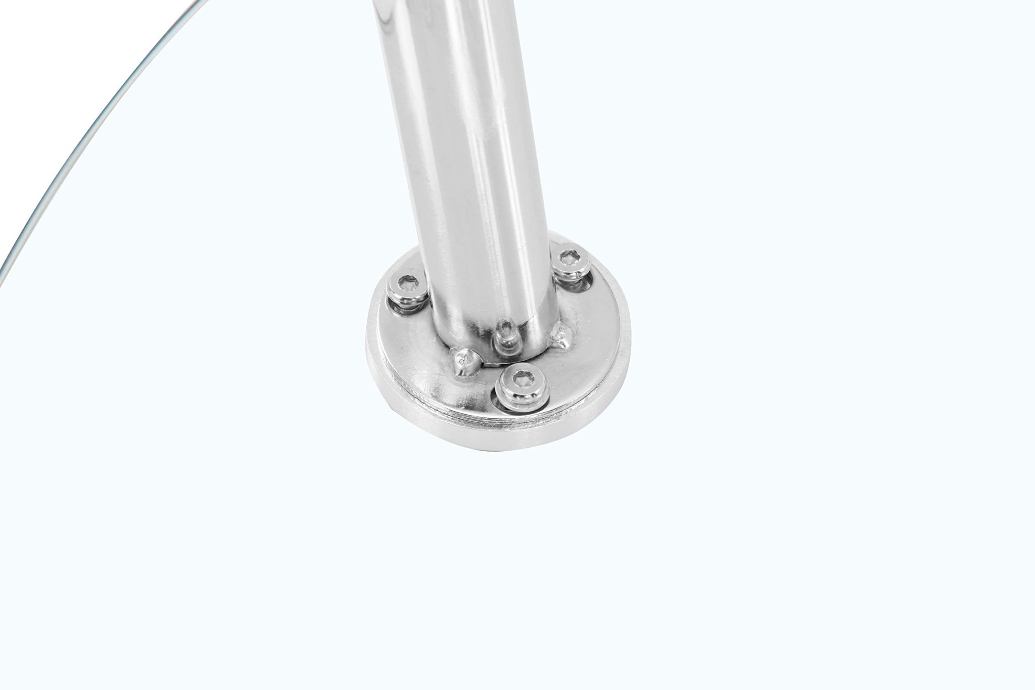 Esstisch Rund: Die Tischplatte besteht aus transparentem gehärtetem Glas. Die Tischbeine sind Metallbeine.