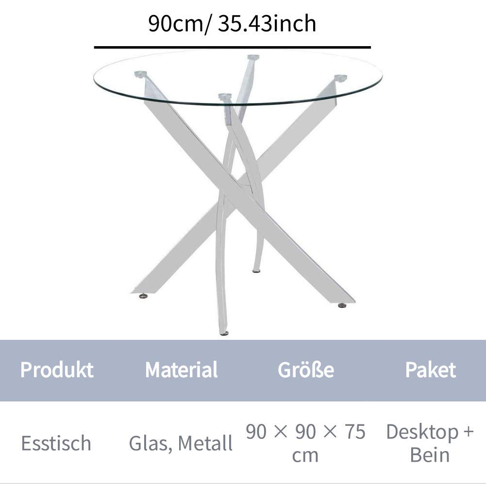 Esstisch Rund Glas Moderner Küchentisch Runder Glastisch Esszimmertische für Esszimmer Wohnzimmer Küche, 90 cm, Silber DE | LEUKHOUSE