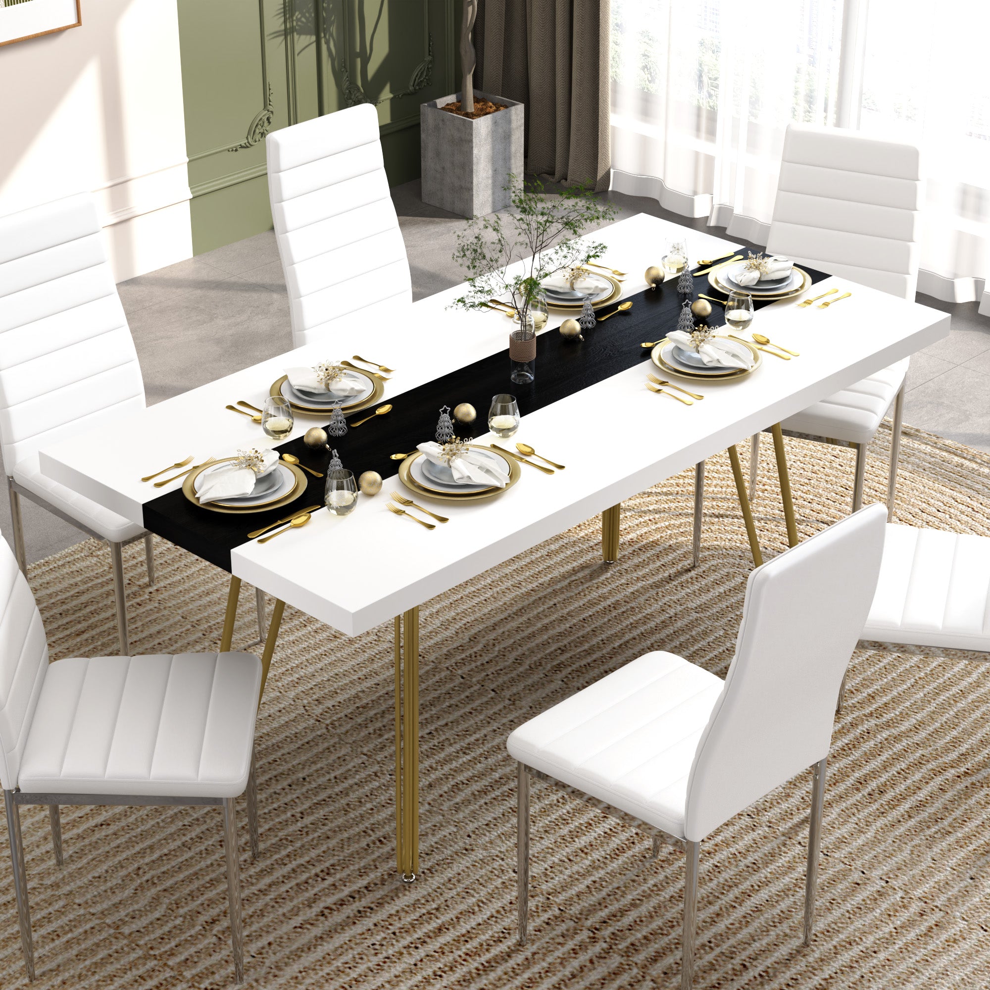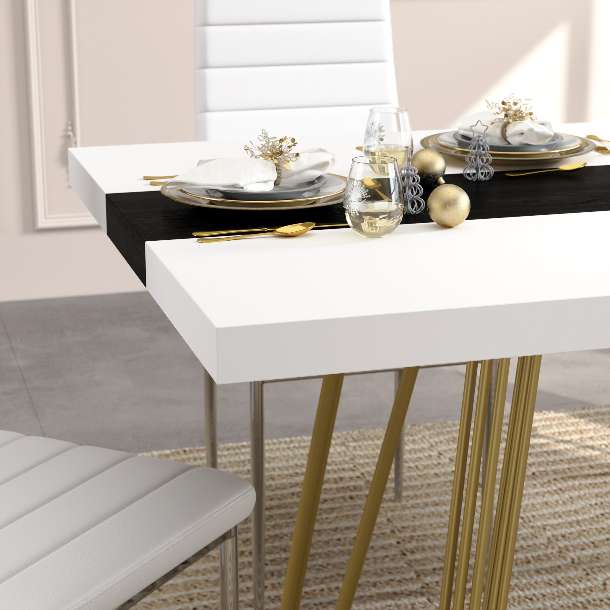 【Sturdy Kitchen Table】:The dining table top is assembled from 3-piece splicing table top, 50mm P2 MDF with malemine veneer(white+wood pattern) with PVC trim for more protection. The golden powder coating legs provide a solid and strong structure to support the MDF tabletop with excellent sturdiness and long-lasting durability, which with 360°rotatable adjustable feet to keep it stable even on uneven ground
