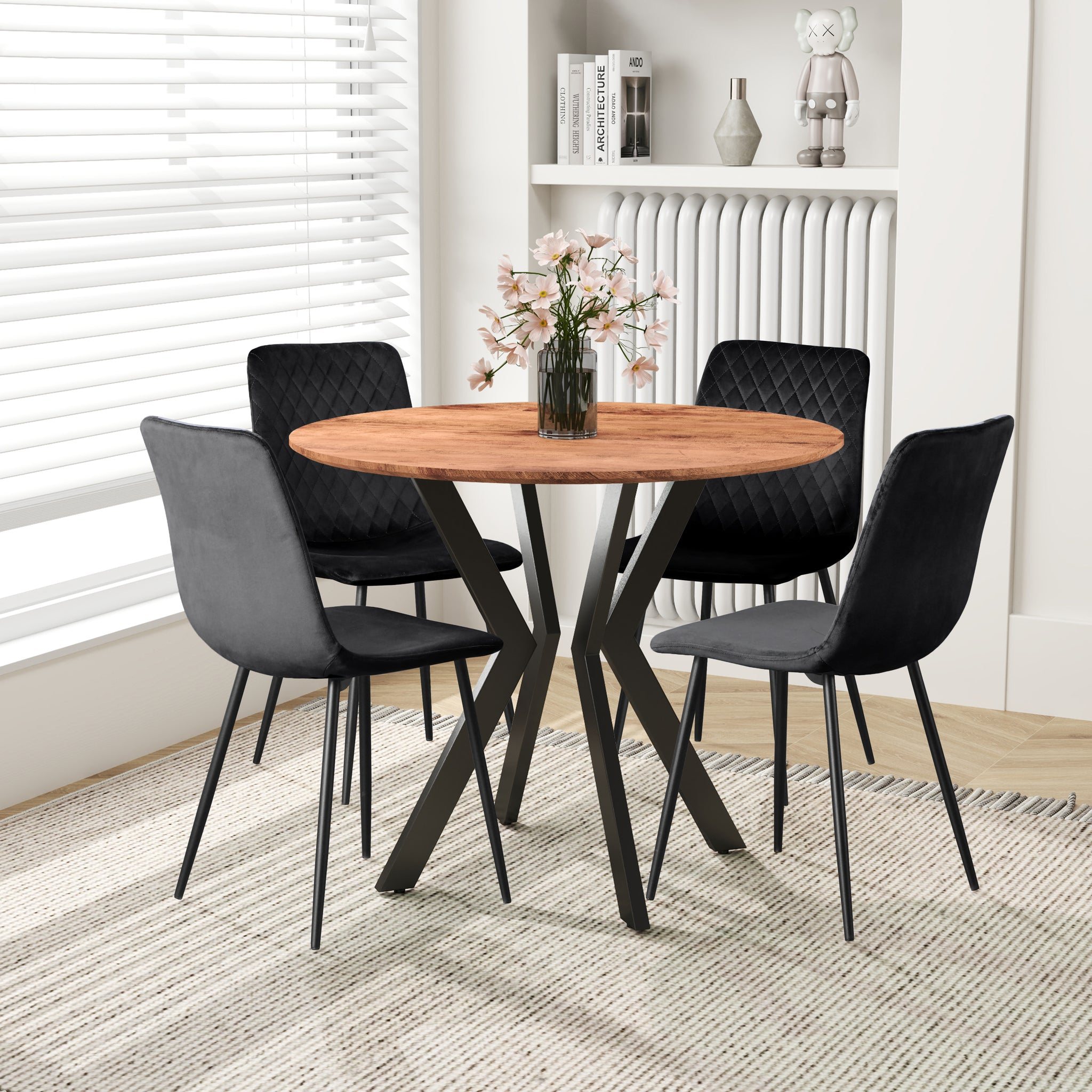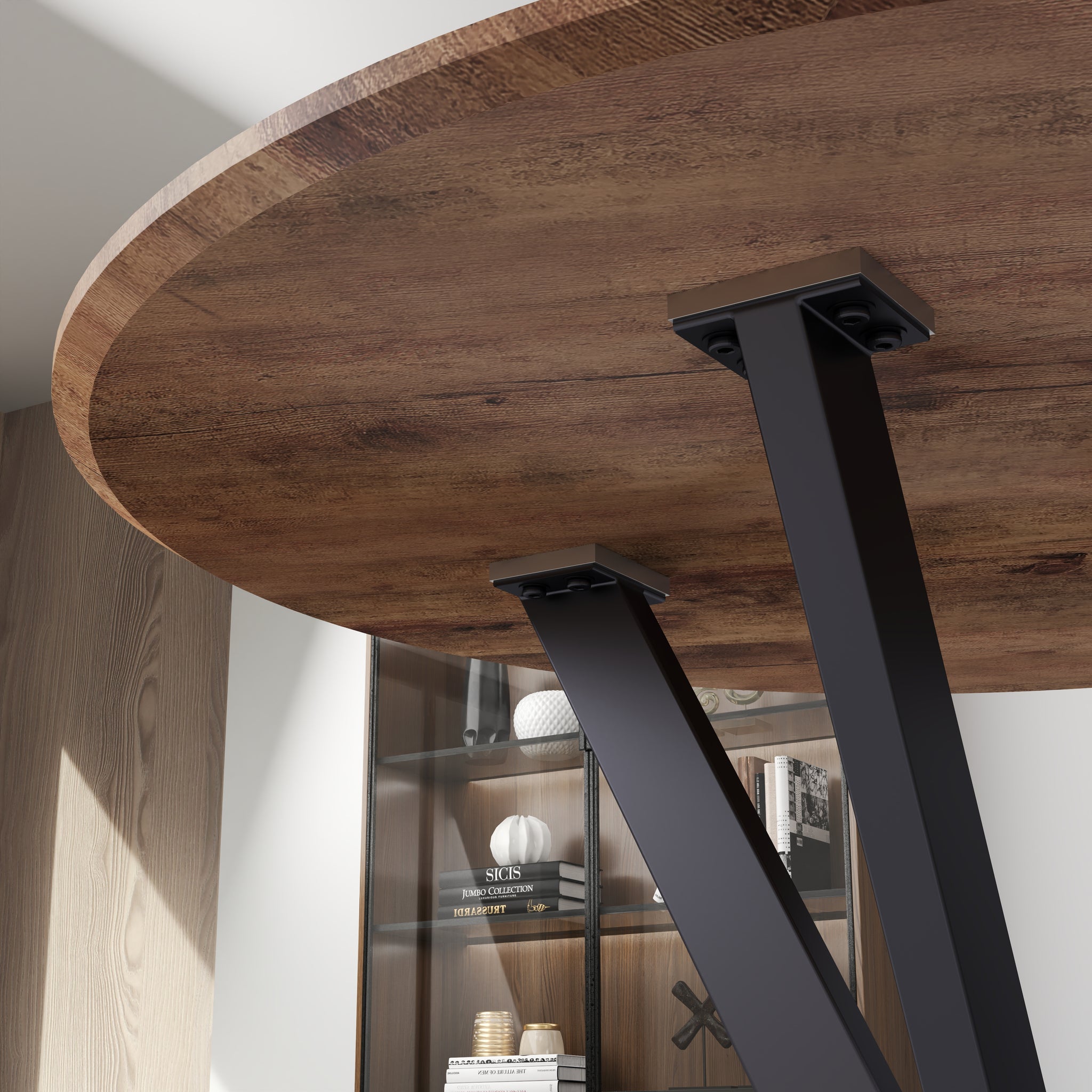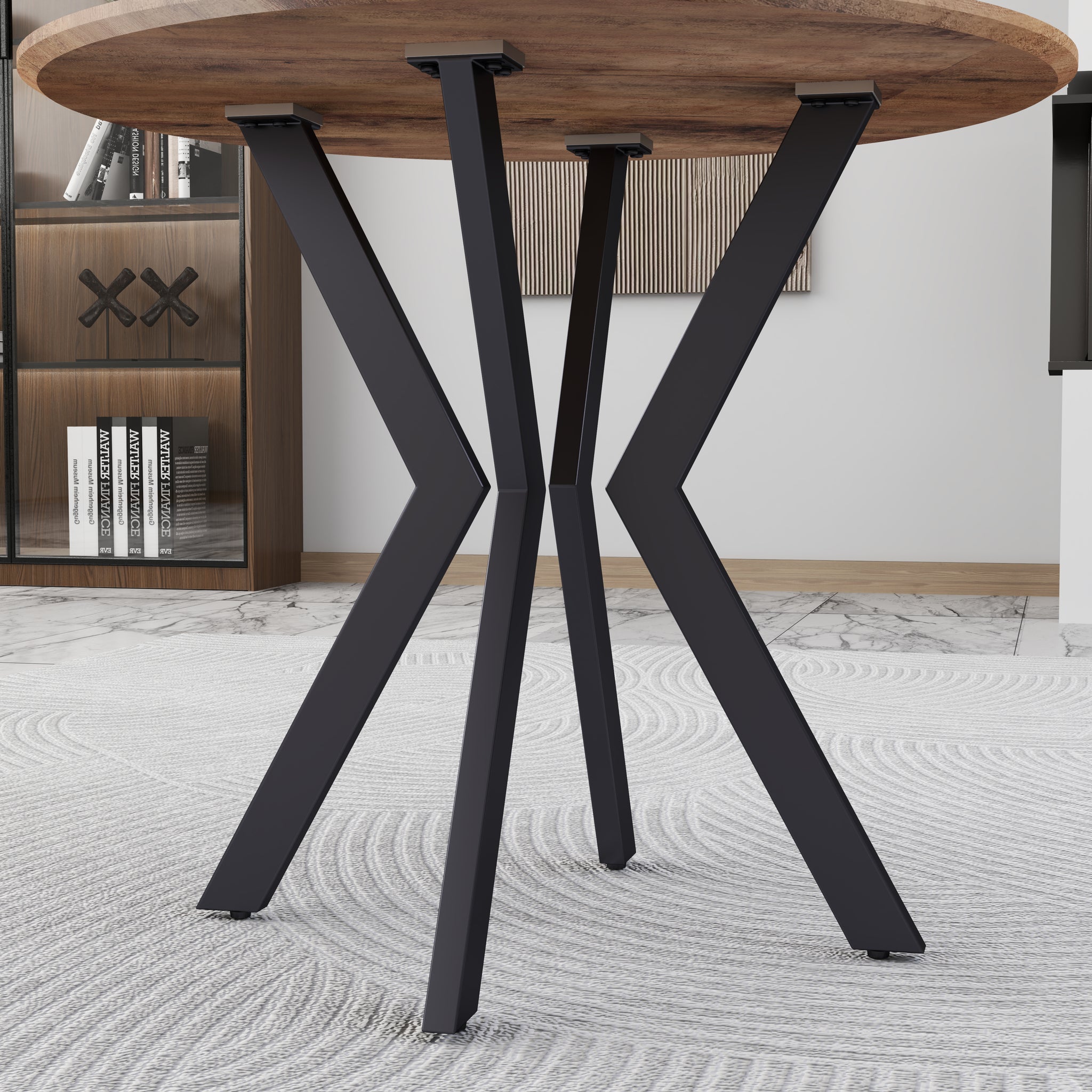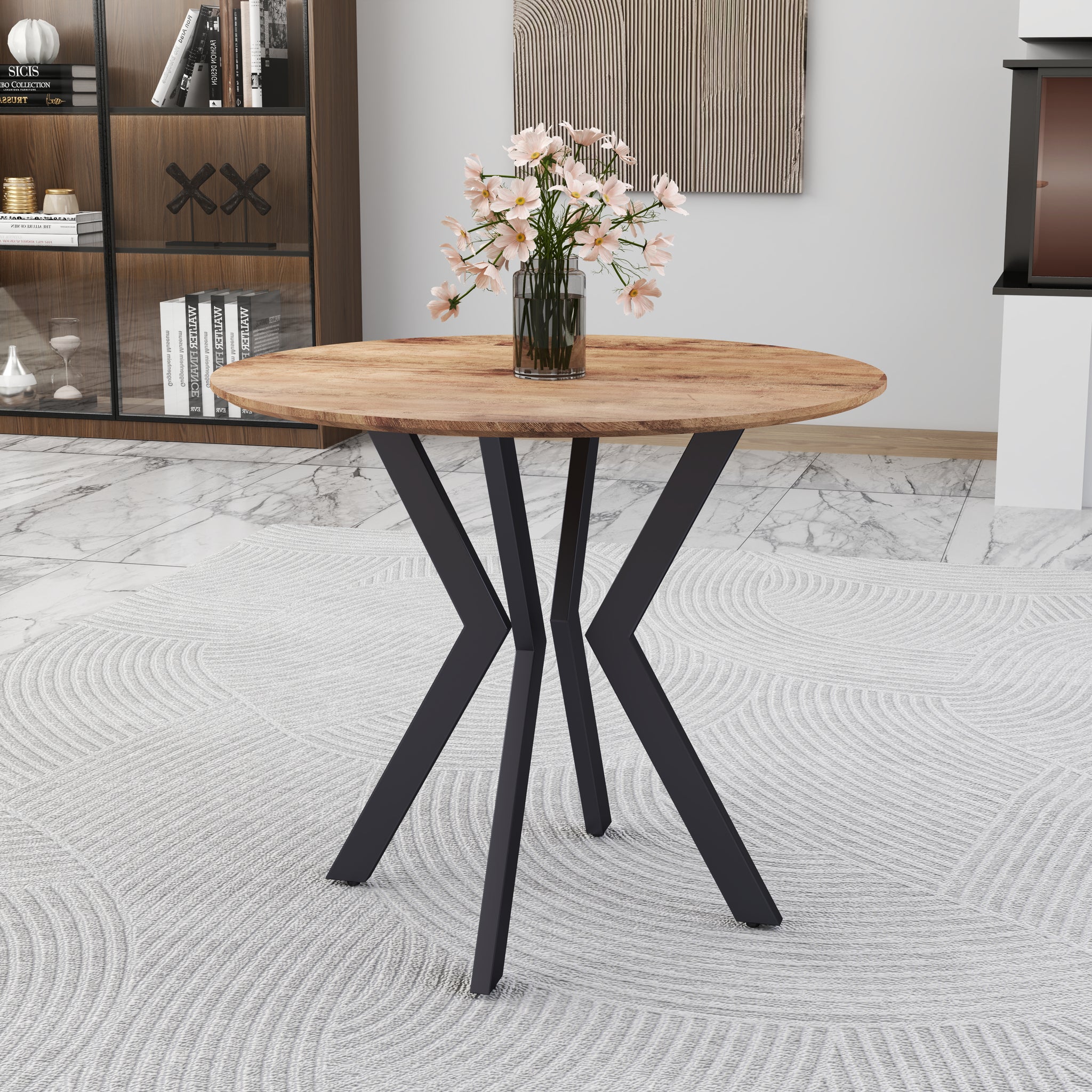 Design élégant : Cette table à manger ronde bois possède une structure en X en métal noir mat pour un style industriel chic et moderne